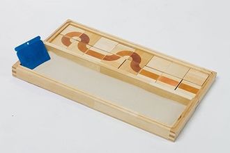 Комплект используется на занятиях с детьми, чтобы скоординировать движения глаз и рук, сформировать навыки письма и владения письменными принадлежностями. С помощью 16 деревянных табличек педагог составляет образец линии и предлагает ребенку неоднократно провести пальцем по рисунку, а затем просит повторить узор на песке. Усвоив принцип, дети могут самостоятельно составлять и копировать «дорожки». В комплекте методические рекомендации.